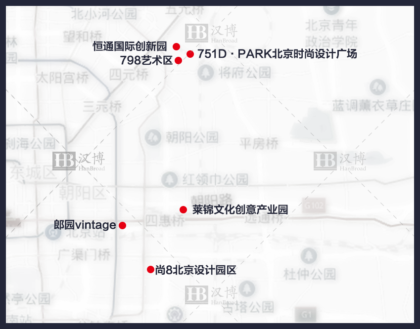 798艺术区→751D·PARK北京时尚设计广场→恒通国际创新园→郎园vintage文化创意产业园→尚8北京设计园区→莱锦文化创意产业园