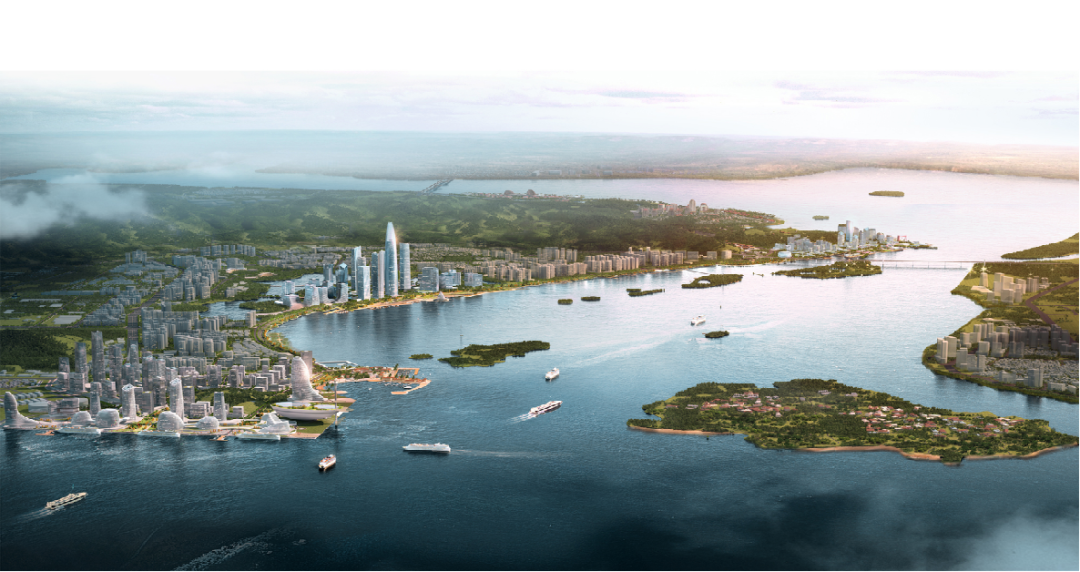 项目占地面积10.45万㎡,总建筑面积61.6万㎡,总投约75亿元。项目A、B、E、F座为5A甲级写字楼体量26万㎡,C、D座为国际星级酒店与会议中心(总投资约22亿元),各座低层打造8万㎡业态商业中心。