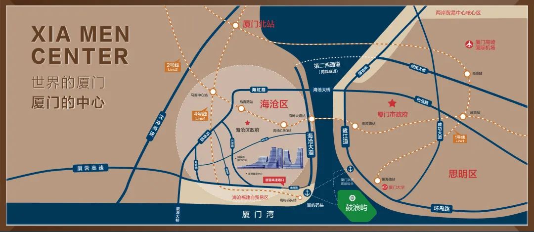 厦门中心坐落厦门市海沧区海沧大道海沧CBD南端,东面一线临海,对望世界文化遗产“鼓浪屿”和厦门本岛,与厦门本岛直线距离最近处不到2公里;南面毗邻厦门港、厦门自贸区;西面怀抱海沧湖;北面连接集美,并通过海沧大桥直通厦门岛。生态资源优势明显,并且与机场、高铁、港区等核心枢纽行程半小时交通圈,与地铁2号线、4号线无缝连接,区位优势显著。