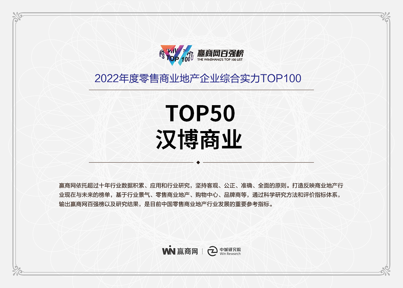 12月20日,汉博商业入选赢商网与中城研究所颁发的“2022年度零售商业地产企业综合实力百强榜TOP100”。