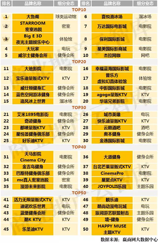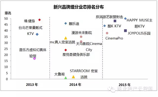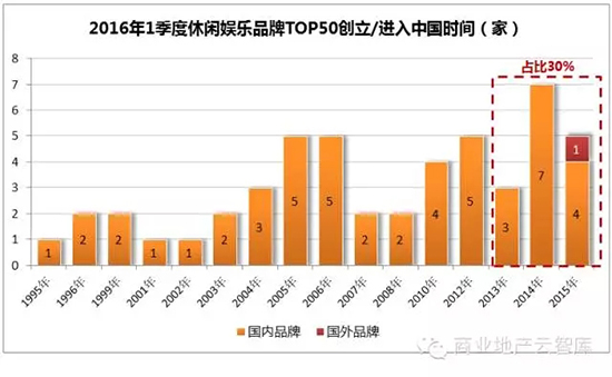2013-2015年间创立/进入中国的休闲娱乐品牌上榜15席,其中93%为国内品牌;