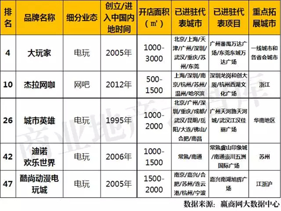 电玩/网吧类品牌共上榜5席,面积需求均在3000m²以内,均为2012年以前创立的品牌,发展较为成熟。