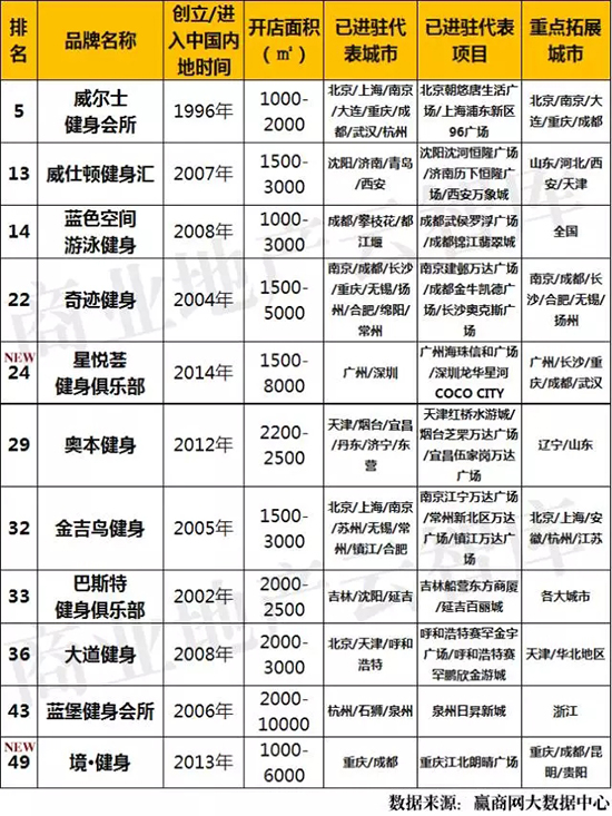 健身会所上榜11席,均为国内品牌,其中2席为新兴品牌,已开店和拓展城市主要集中在一二线城市。