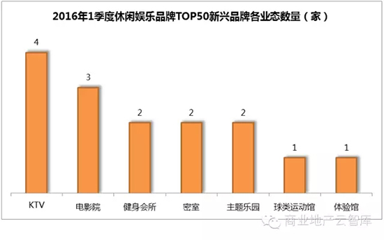 上榜的新兴品牌中,KTV以4席占据主导地位,其次为3席的电影院;健身会所、密室、主题乐园的新兴品牌增量相当;