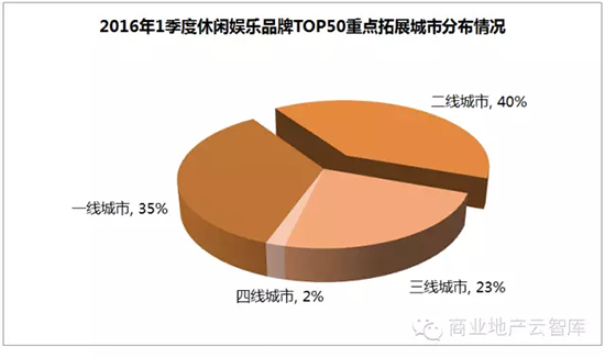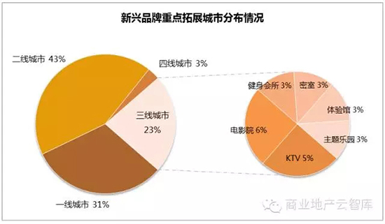 新兴品牌的拓展方向以二线城市较多,其次是一线城市,体现了新兴品牌紧跟整体休闲娱乐市场拓展的脚步;