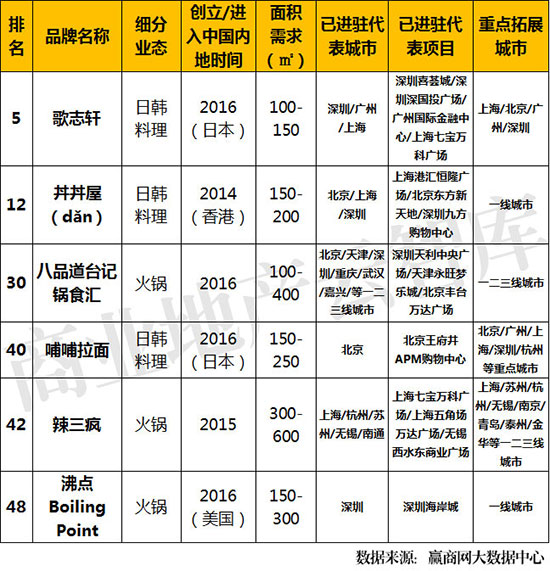 ②6席品牌中,2016年创立/进入中国内地的品牌达4席,其中【歌志轩】【沸点Boiling Point】拓展首选一线城市,【八品道台记锅食汇】【哺哺拉面】意向下沉二线甚至三线城市。