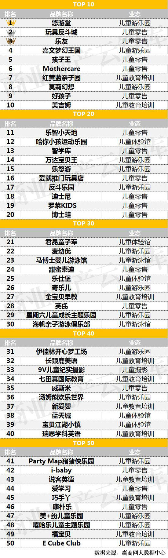 ②上榜成熟品牌占比82%,居主导地位;国外品牌10席,以美国为主,主要为儿童零售和教育培训,其余为日本3席,英国2席,瑞典1席;