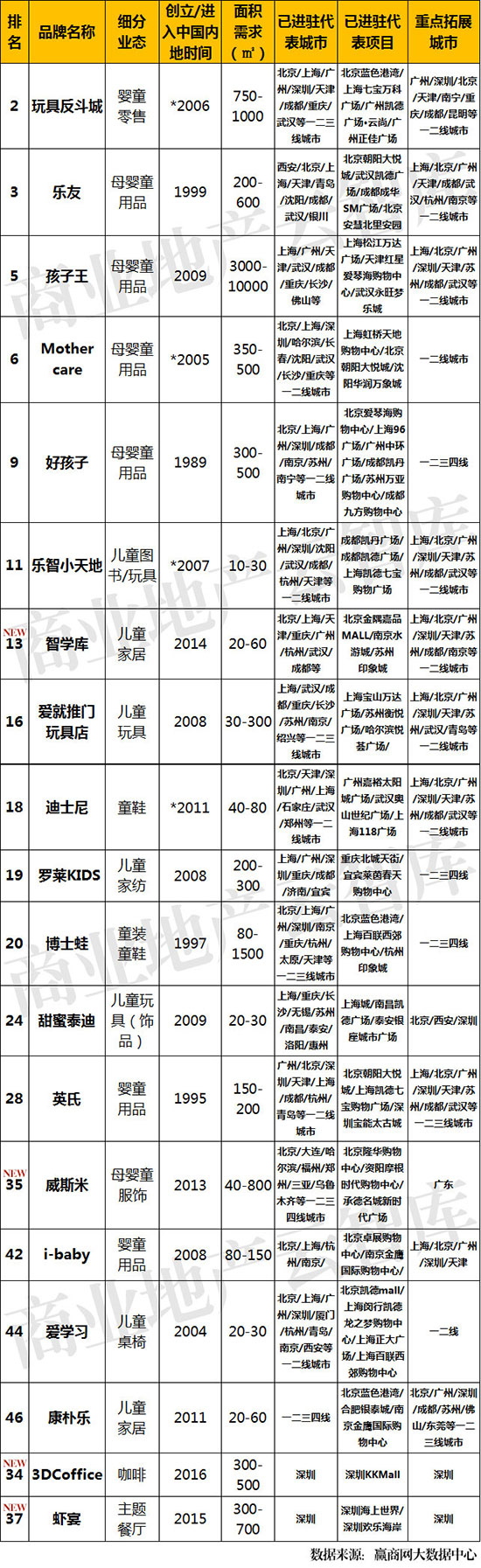①上榜的17席儿童零售品牌中,仅有2席为新兴品牌。国外品牌占有3席:美国的【玩具反斗城】【迪士尼】;英国的【Mothercare】;日本的【乐智小天地】;