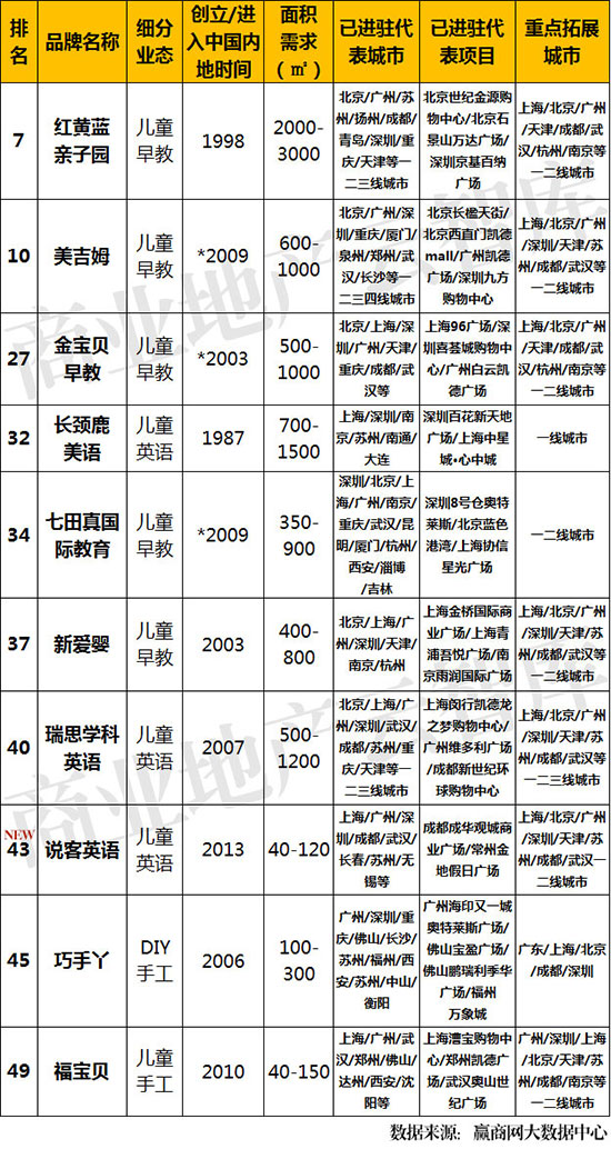 ①上榜品牌集中在儿童早教、英语培训和DIY手工,其中早教占比50%,随着儿童教育注重全面发展,其他业态也将陆续进入市场;