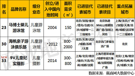 ①本次儿童游泳馆上榜2席,其中儿童游泳馆在服务延伸上将有更广泛的服务链出现,向上拓展至至准妈妈课堂、亲子游、母婴戏水,向下拓展婴儿水中运动潜能开发、婴儿专业游泳技术培训、婴儿水中早教等各个领域。
