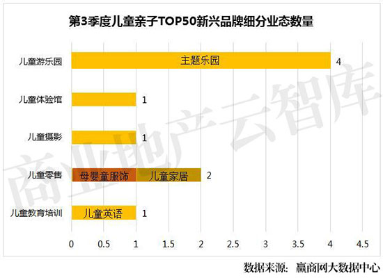 ②从新兴品牌所属业态来看,儿童游乐园品牌数量最多,达4席,占新兴品牌的一半。从细分业态来看,除主题乐园外,其他新兴品牌分别来自儿童摄影、儿童英语、母婴童服饰、儿童家居。