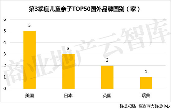 ①上榜的10席国外品牌中,以来自美国的儿童亲子品牌最多,占到了国外品牌的50%,主要为儿童零售和儿童教育培训品牌;其它国外品牌为日本、英国、瑞典,分别占到3席、2席、1席。
