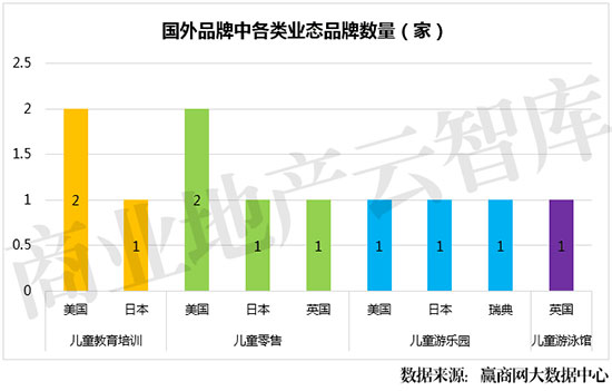 ②国外品牌在各类业态中,以儿童零售品牌数量最高,其次为儿童教育培训与儿童游乐园。其中没有儿童摄影和儿童体验馆业态的品牌。