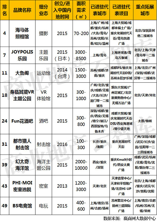 ①上榜的9席新兴休闲娱乐各业态分布均匀,各占1席;