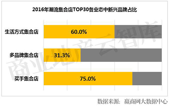 其中,生活方式集合店和买手集合店均以新兴品牌为主,占比分别达到60%和75%。
