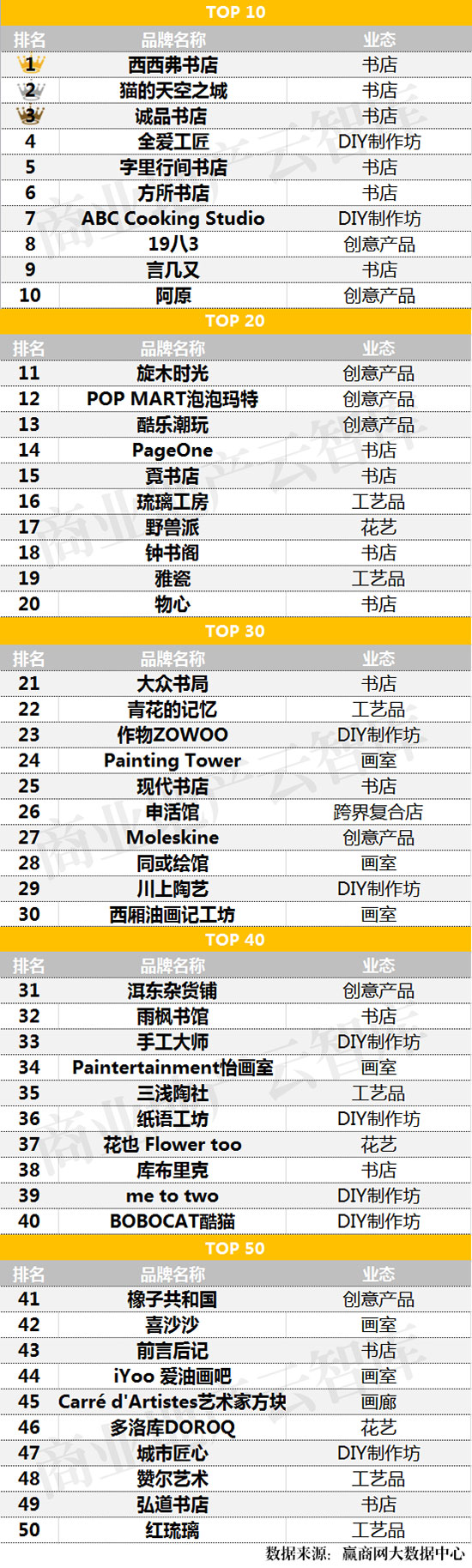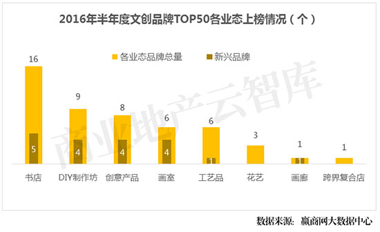 汉博商业旗下智库汉博商业研究院联合赢商网大数据中心,于日前权威发布2016年上半年最受关注文创品牌TOP50。这其中,哪类业态入选最多?为何书店品牌所占比例较高?文创业态有哪些发展趋势?更多详情,请见如下榜单: