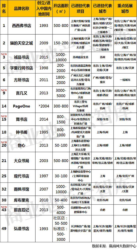 新兴品牌共5席,多于2013年创立,内地新兴品牌拓展速度较快,连锁能力较强; 国外品牌占1席,为新加坡品牌【PageOne】;