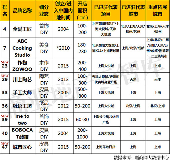 DIY制作坊品牌共9席,比上年度多4席,DIY制作坊这个起步较早的业态在体验式商业的刺激下又重新回到大家的视野;