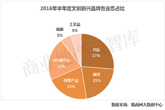 ③新兴品牌中书店占27%,居主导地位,画室、创意产品、DIY制作坊也紧追其后;