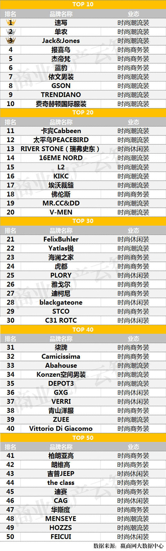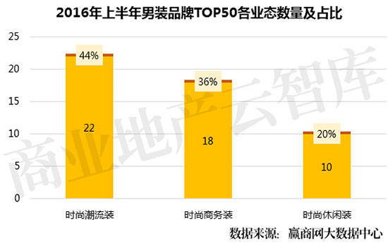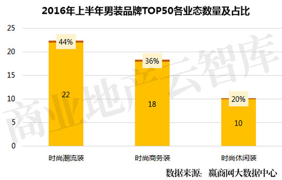 从细分业态来看,时尚潮流装男装最受消费者欢迎,达22家,占到整个榜单的44%;其次为商务装。