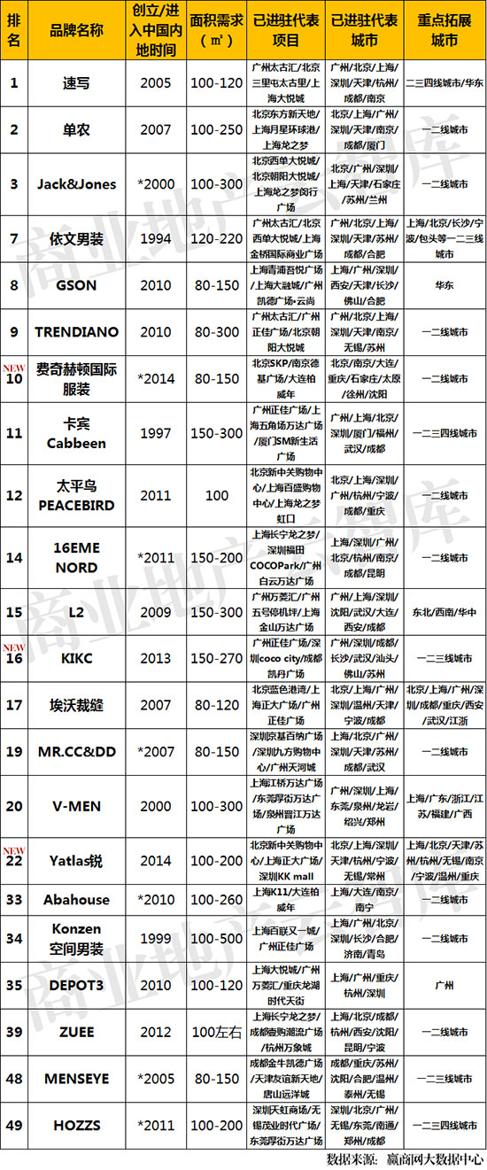 ④男装品牌在拓展上依然以全国一二线城市为主。
