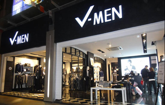 【V-MEN】是2000年正式登陆内地市场的香港品牌,主力客群为25-35岁的潮男。品牌主线分为英伦风尚和潮流个性两大系列,配以黑、灰、白的三种中性色为主要基调。