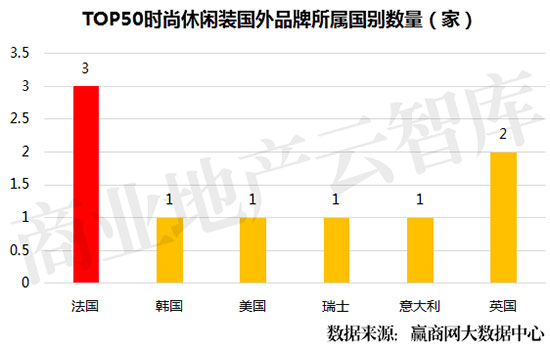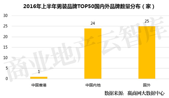 TOP50中,国内外品牌均占25席,其中中国品牌中,香港占到1席。本次榜单中国外男装品牌受关注度迅速提升,越来越受购物中心青睐。