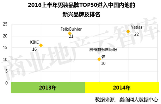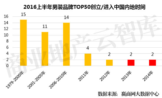 TOP50中,新兴品牌仅上榜4席,其中创立于2013年的品牌占2席,2014年为2席。其中国内和国外品牌各占2席。可以看出,男装中成熟品牌更受关注。