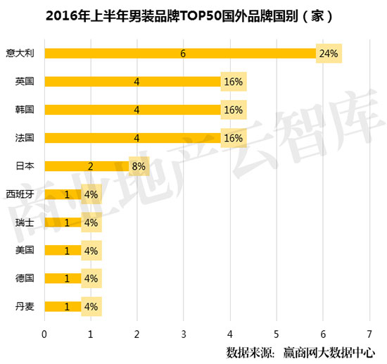 上榜的25席国外品牌中,以来自意大利的男装品牌最多,占到了国外品牌的24%;其次为英国、法国、韩国,均占到4席。