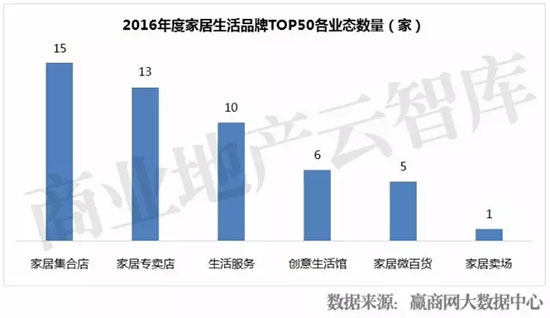 TOP50中,仍以家居集合店和家居专卖店为主,生活服务类品牌上榜数量微升,达10席;创意生活馆、家居微百货发展看好,分别上榜6席及5席;家居卖场仅上榜1席;