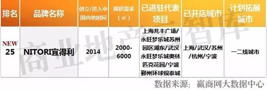 【NITORI宜得利】来自日本的家居连锁品牌,产品包括大型家具、家庭用品及室内装修用品等。该品牌目前在中国内地已开设约10家门店,2017年计划于一二线城市拓展3家门店。该品牌规划至2022年在中国的店铺增至100家,2032年增至1000家店。