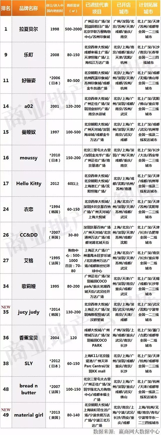 注:本榜单中带*年份为国外品牌进入中国时间,带有“NEW”表示品牌为2013年及以后创立/进入中国内地的新兴品牌